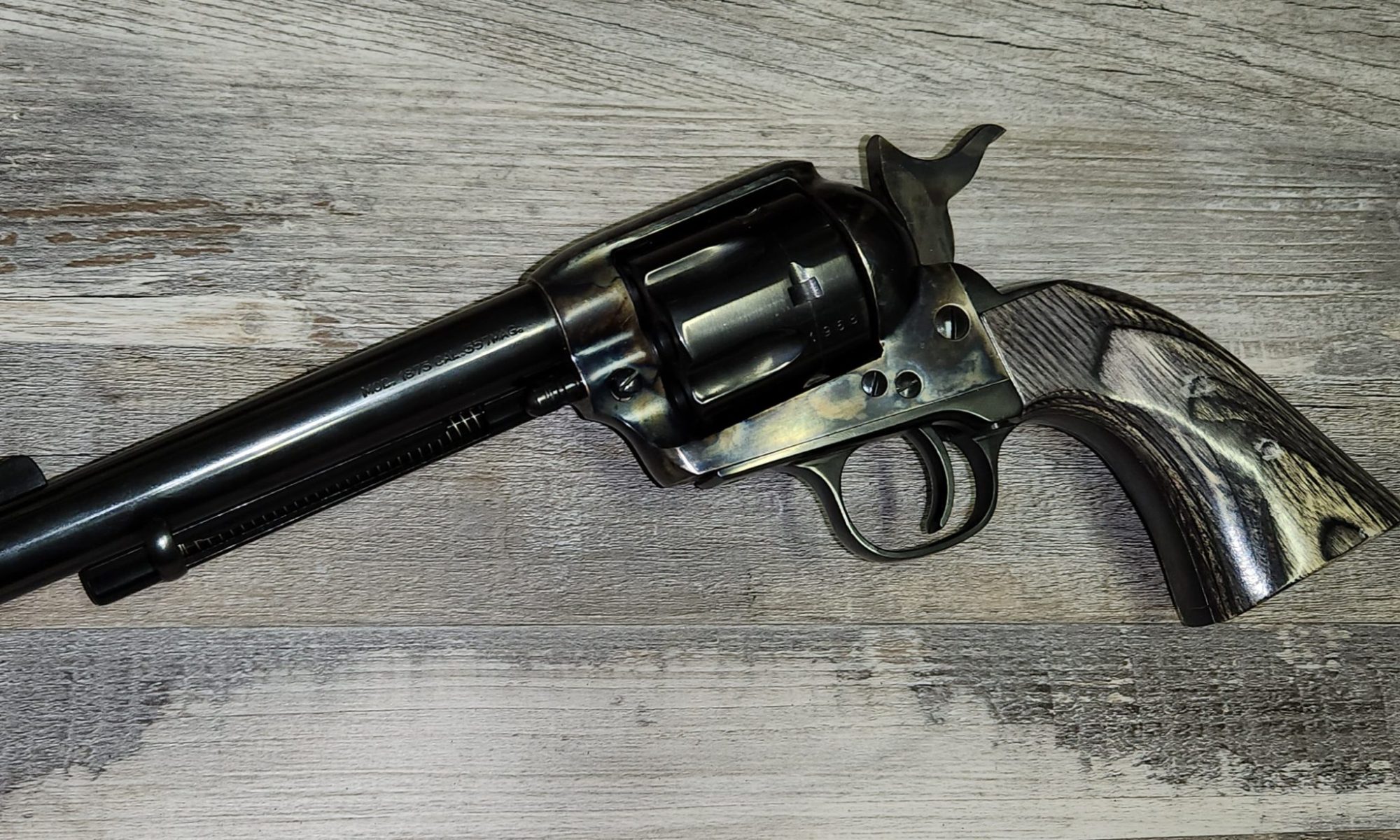 Cattleman in the standard finish feature: case-hardened forged steel frame, blued steel parts, smaller Navy-size grip, wider front fixed blade & rear sight frame notch, and spring-retained quick release cylinder pin. Features a transfer bar safety.